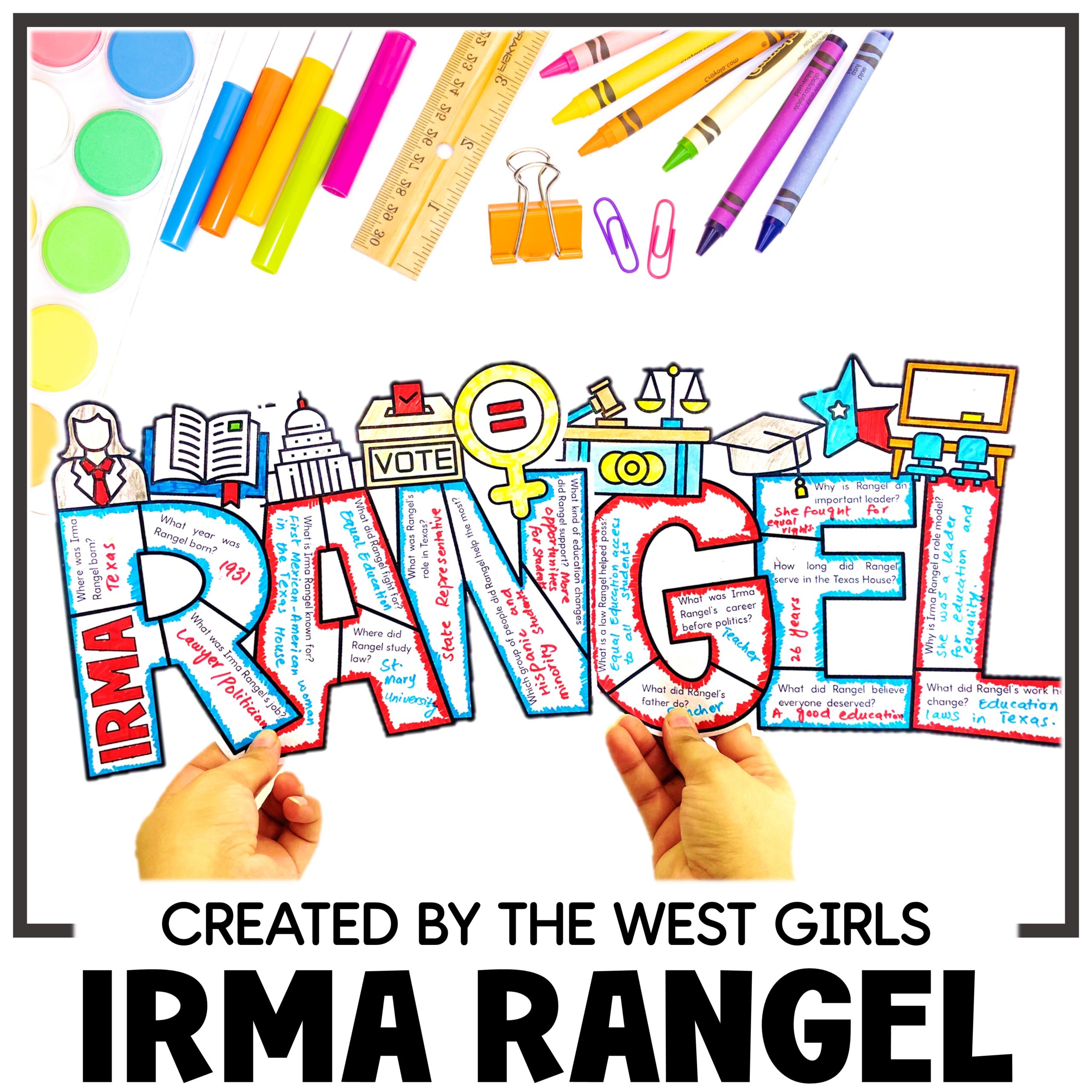 If you’re looking for a great way to start celebrating Hispanic Heritage Month, this art lesson project is perfect! It highlights Irma Rangel, the first Latina elected to the Texas House of Representatives. Students will complete biographical prompts, color the letters and illustrations, and assemble the word RANGEL.